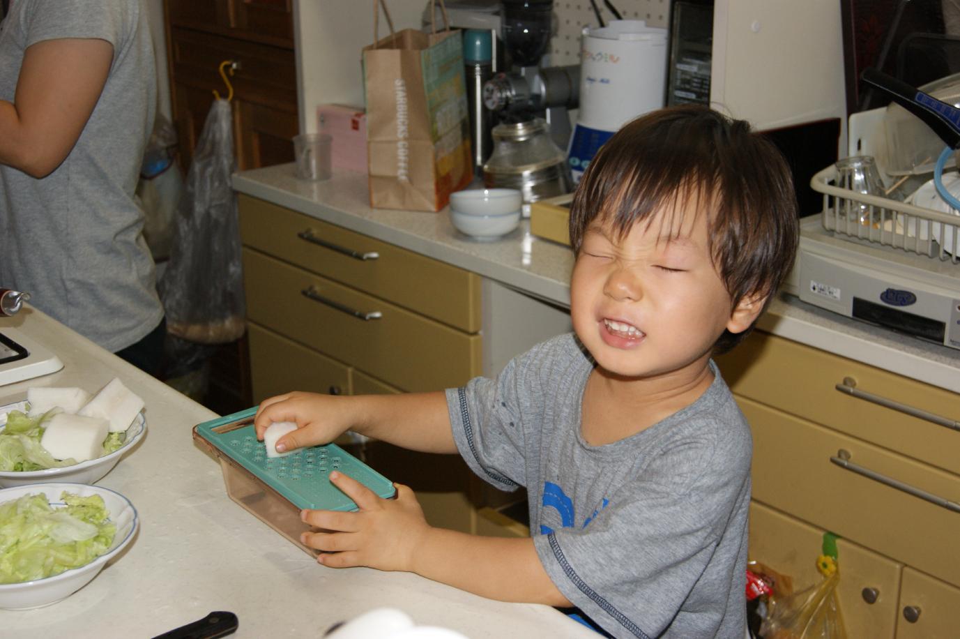 大根をおろすのを手伝ってるよ。
