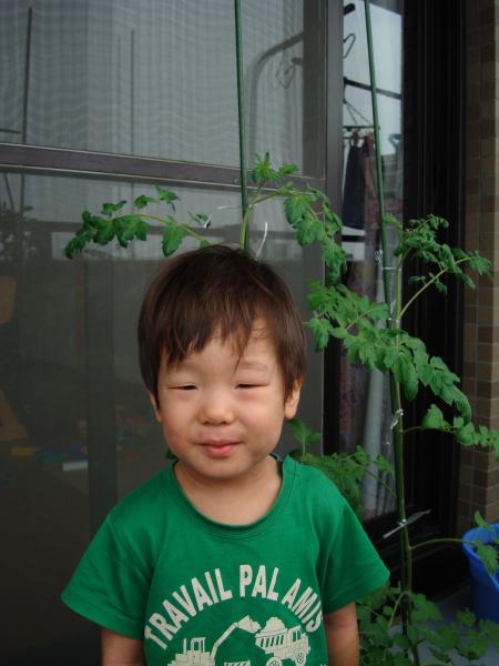 ええ~~~。ゆうくんよりもトマトのほうが背が高いんだ!すごいね。もう鉢植えじゃ狭いよ~って言ってるかな?