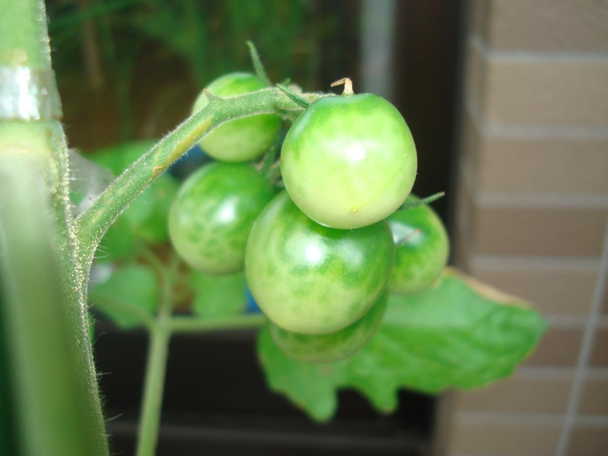 プランターのプチトマトの実、まだ赤くならないんだけど、実が少し