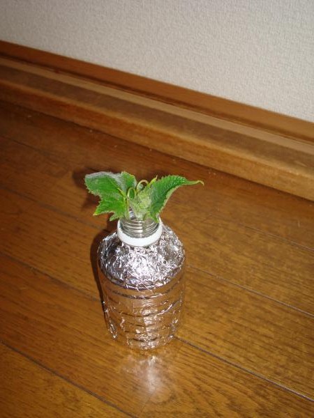 それから、トマトのわき芽をペットボトルに差して根っこが出たん