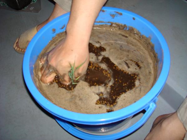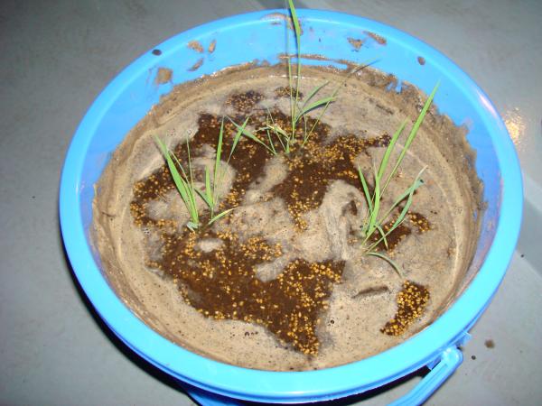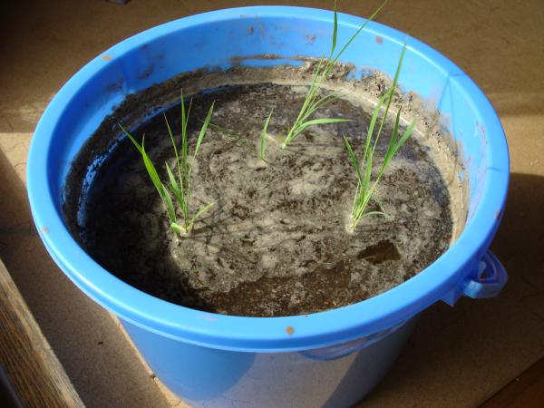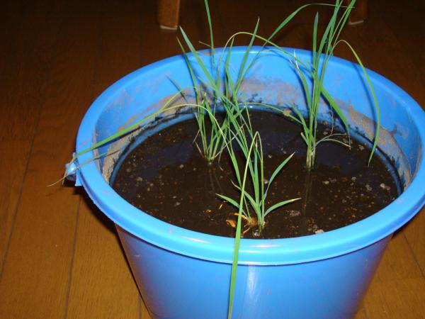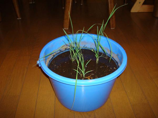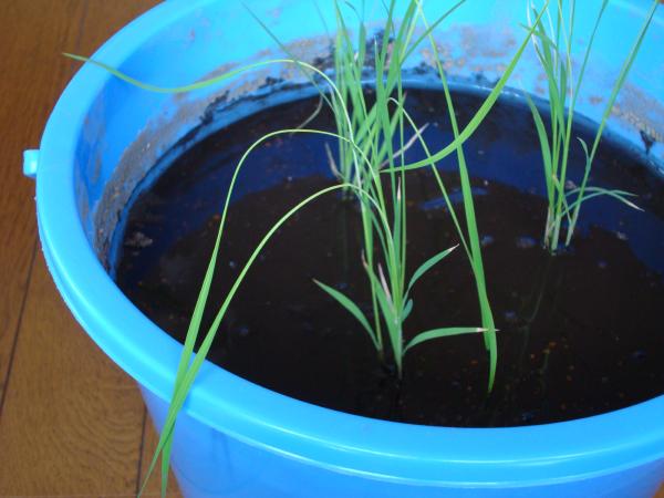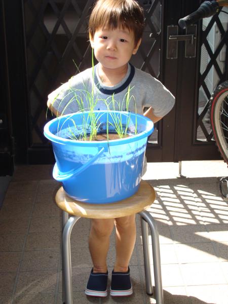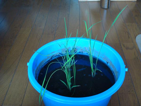今日は、よい天気なので、バケツ稲をげんかんに持ってきました。