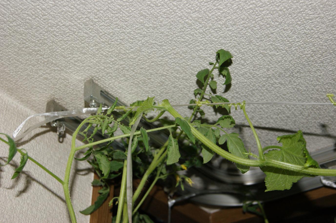 出窓のペットボトル水耕栽培のきゅうり、天井に伸びてから、天井近く