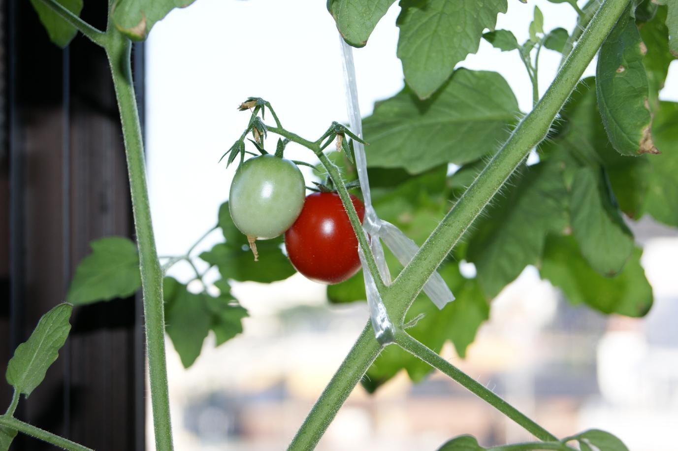 今朝、出窓のペットボトル水耕栽培のプチトマト2個ときゅうり1本を