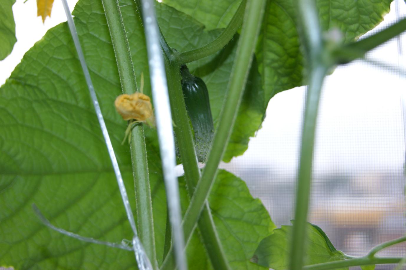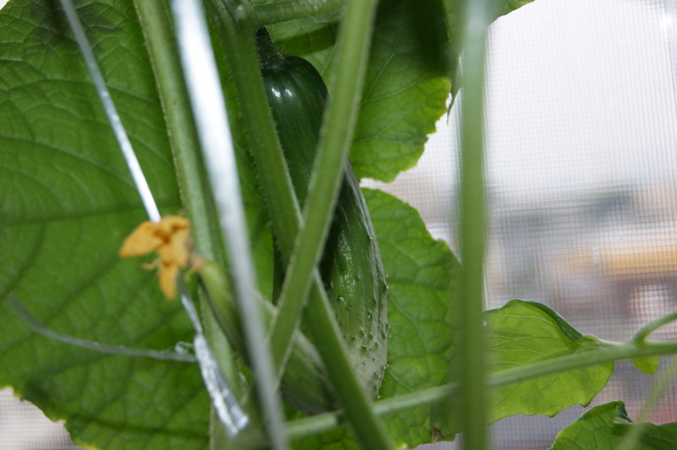 出窓のきゅうりに実が