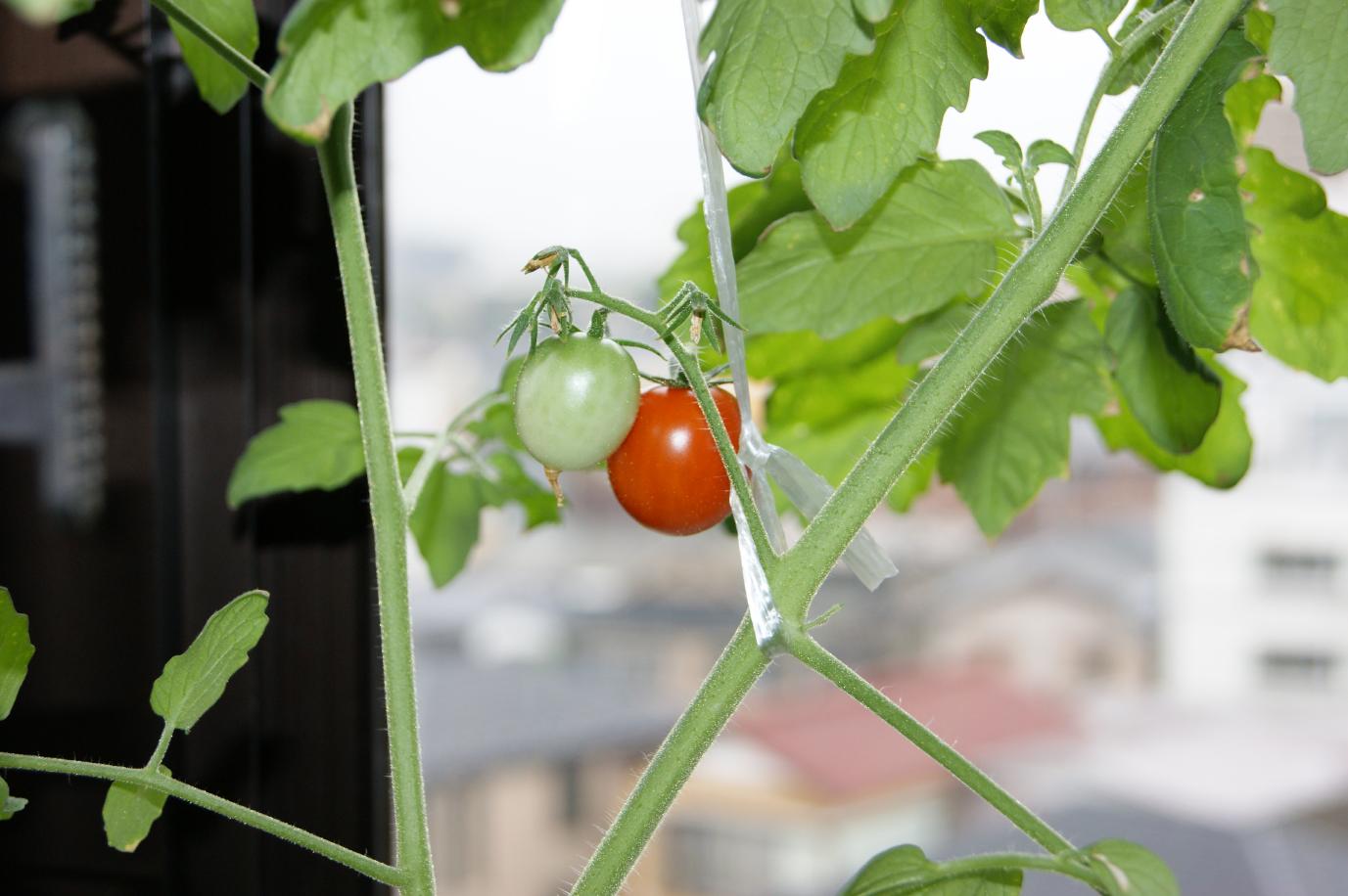 出窓のプチトマトが色づきだしたよ