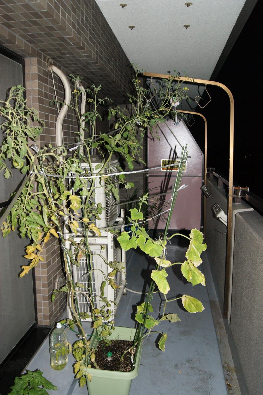 パパ、バケツ稲とトマトたちの
